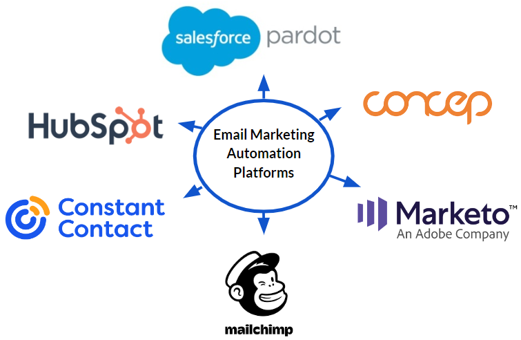Email marketing automation platforms provide drag & drop editors, subscriber management, scheduled bulk sends, and reporting.